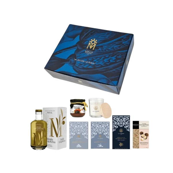 El Lote Gourmet Chocolate y Aceite de Marcos Tonda combina la tradición del mejor chocolate artesano con la excelencia de productos gourmet de la tierra. Incluye una selección de tabletas de chocolate La Virgen en diferentes variedades, una tableta premium con macadamias, junto con un exclusivo aove Masía Villaplana y un tarro de mermelada que aportan el toque más auténtico. Todo ello presentado en un estuche elegante, pensado para quienes buscan un detalle sofisticado, lleno de sabor, tradición y calidad.