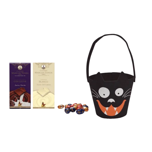 El Lote Halloween Gato Marcos Tonda es perfecto para disfrutar de una noche terroríficamente dulce. Incluye una divertida cesta con diseño de gato negro, ideal para los peques, acompañada de deliciosas tabletas de chocolate con leche y chocolate blanco, junto a surtidos de chocolatinas envueltas en colores festivos. Un detalle original y sabroso que convierte Halloween en una fiesta llena de alegría y dulzura.