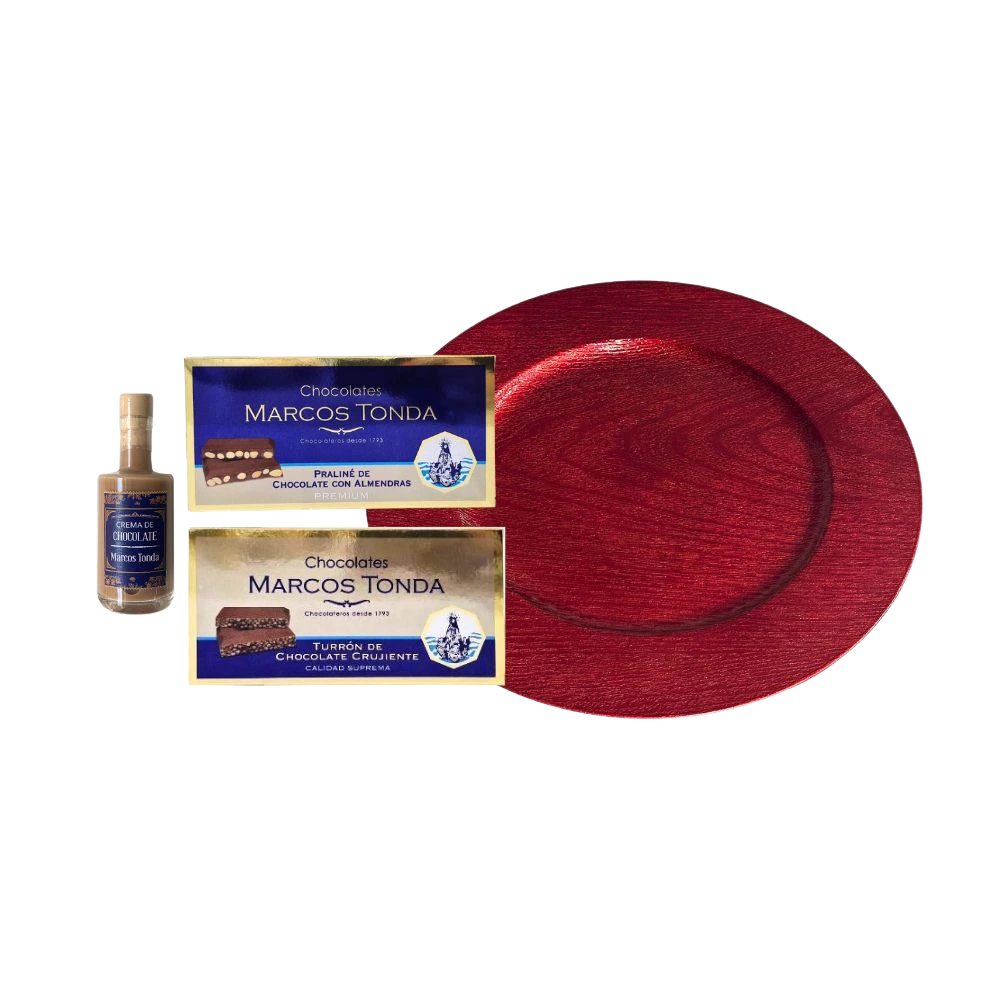 Lotes EscolaresLa Bandeja Navideña de Marcos Tonda es un regalo que combina elegancia y sabor en un solo detalle. Presentada en una bonita bandeja metálica roja, contiene una cuidada selección de delicias: un crujiente de chocolate, un praliné de chocolate y una crema de chocolate en bote de 0,1 cl. Una propuesta perfecta para sorprender en colegios, empresas o celebraciones familiares, uniendo tradición artesana y presentación festiva para disfrutar en estas fechas tan especiales.