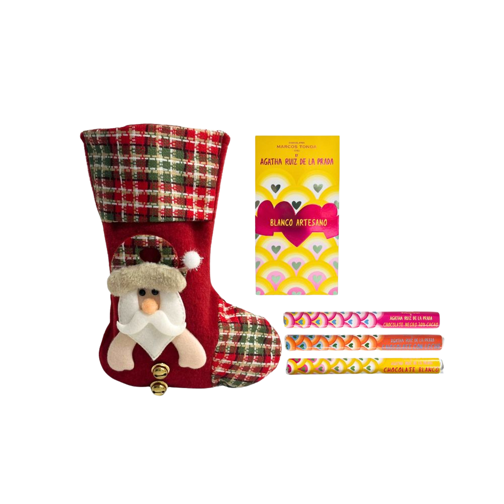Lotes EscolaresLa Bota de Navidad de Marcos Tonda es un regalo original que combina tradición y diseño. Esta simpática bota de fieltro es perfecta para decorar y sorprender en estas fiestas, y llega acompañada de una cuidada selección de chocolates Agatha Ruiz de la Prada: una tableta de chocolate artesano blanco y tres chocolatinas de 30g en sus variedades 70% cacao, con leche y blanco. Una propuesta llena de color, sabor y creatividad, ideal para colegios, empresas o para compartir en familia durante la Navidad.
